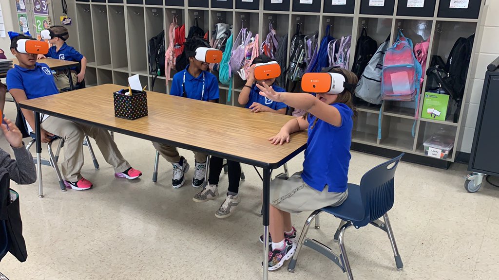 One of our favorite examples of this is with our third grade teachers, who use VR to supplement their ELA lessons. They celebrate “commitment days” when they teach about certain topics like the ocean, immigration, or space. On these days, students break into small groups and complete activities at different stations. One station involves the use of VR headsets to explore videos on the subject.